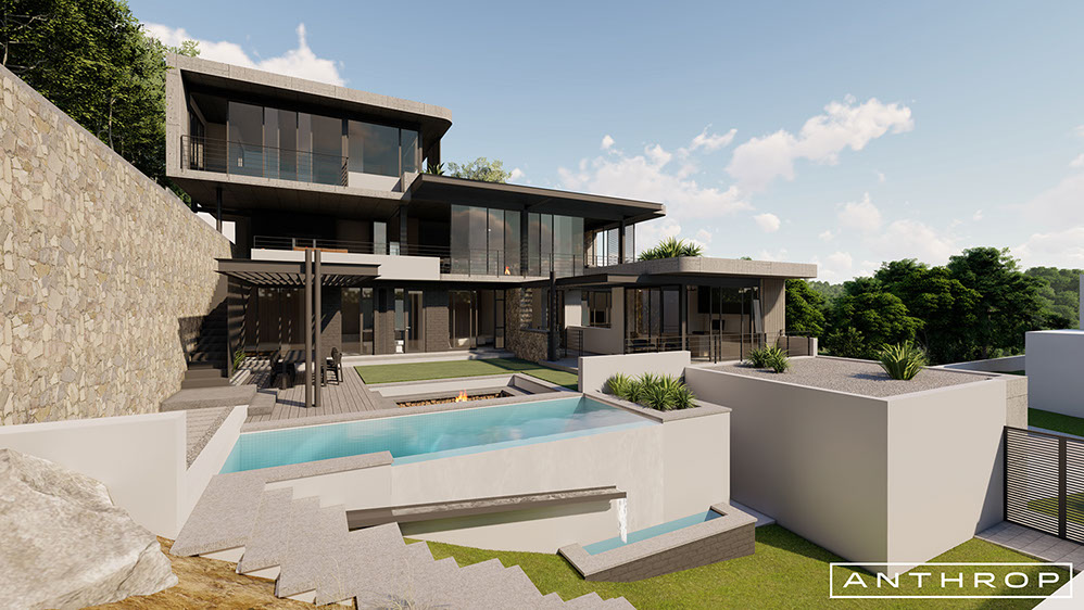 This project is located in a luxury residential estate and positioned on a steep western sloping stand. The client’s specific brief from the start was to maximise the views to the north and west, and to have a connection to the nature reserve to the east. During the design phase it was decided to place the open living spaces on the first storey to maximise these panoramic views, and to place the main bedroom suite on the top level to provide an uninterrupted connection with the nature reserve to the east.