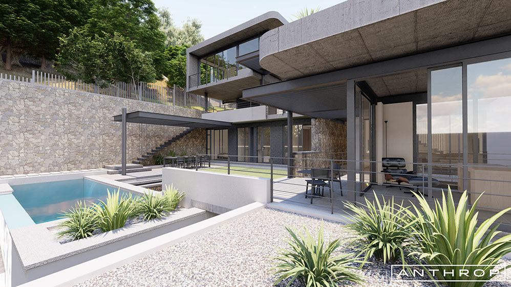 Various cool to warm shades of architectural grey paint colours and off-shutter concrete soffits, are balanced with warm natural rock cladding and timber surfaces in vertical applications. Rainwater collection tanks are installed and gathers rainwater from the roof, and then utilized to irrigate the garden.