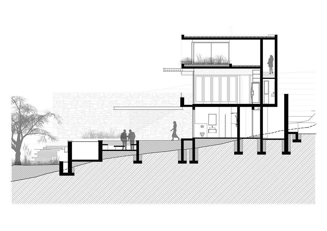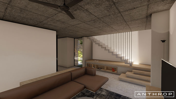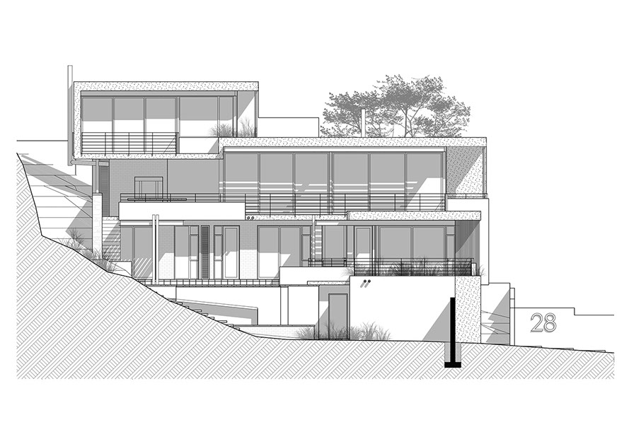 The house is subsequently divided into four levels. The lower ground storey contains the garage and entrance into the house; the ground storey contains the bedrooms, bathrooms, study and PJ Lounge; the first storey contains all the interior open plan living spaces and outdoor living spaces; and the second storey contains the main bedroom suite. Accessing the stand from the west, visitors arrive at street level, and are then guided by a walkway leading towards a natural rock cladded wall from the arrival area up towards the front door.