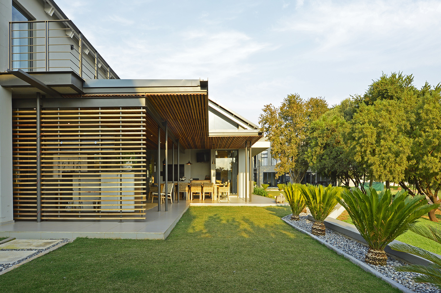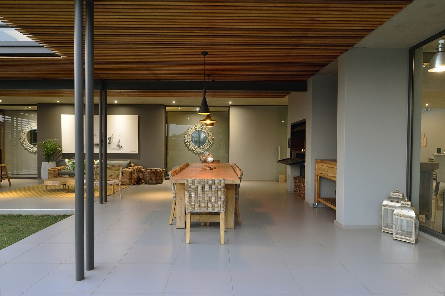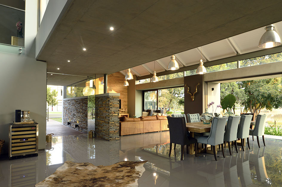 Another concern was capturing the magnificent dam view to the South but yet somehow gaining much needed northern sunlight.The stand shape also didn’t lend itself in favor of the envisaged planning forcing the required 3 garages onto the cul-de-sac north east of the stand. The floor plan therefore features an open plan living, dining & kitchen area with 2 bedrooms off a central axis or rather “hallway” running east and west and a shared bathroom at the most western end of the house. Large windows in the hallway frames vistas over the magnificent dam views and established estate landscaping.
