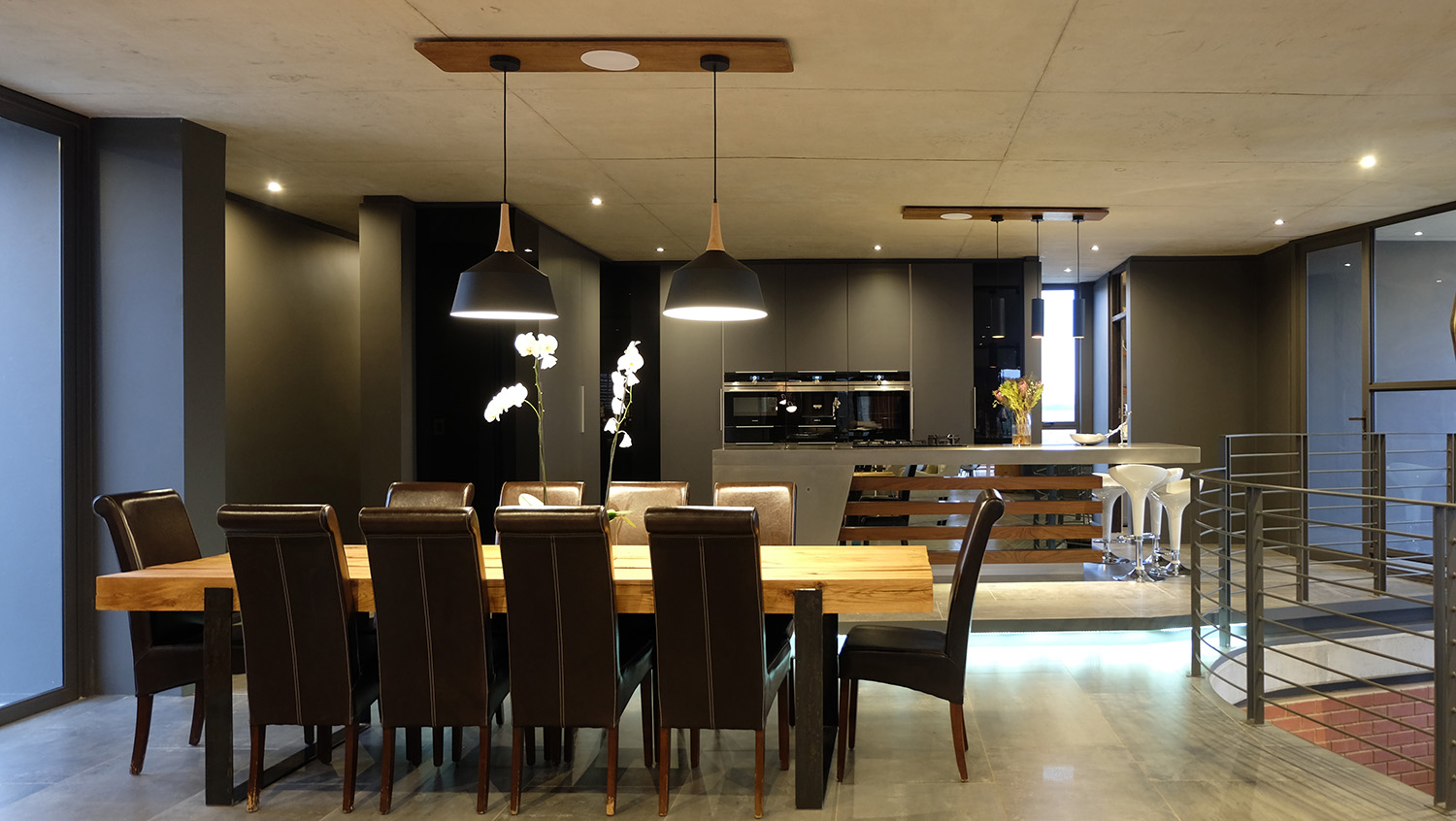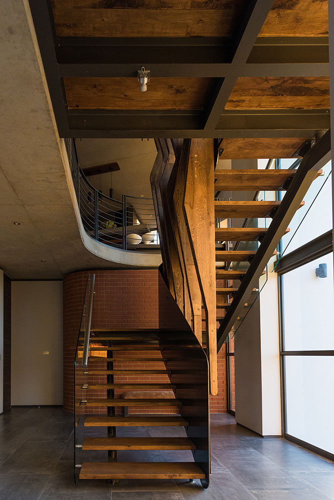 The upside down planning dynamic lead to the introduction of a secret loft room for the client’s young daughter and a large wine cellar and craft beer brewery area underneath the kitchen with a “secret passage” leading you down into what feels to be a deep and dark underground basement.The first floor patio, links with the pool deck area via a dramatic spiral staircase showcasing the opportunities of architectural drama that’s created with upside down living, similarly to the effect created with the wine cellar & bedroom loft.