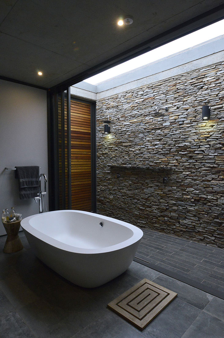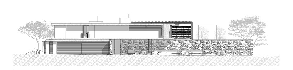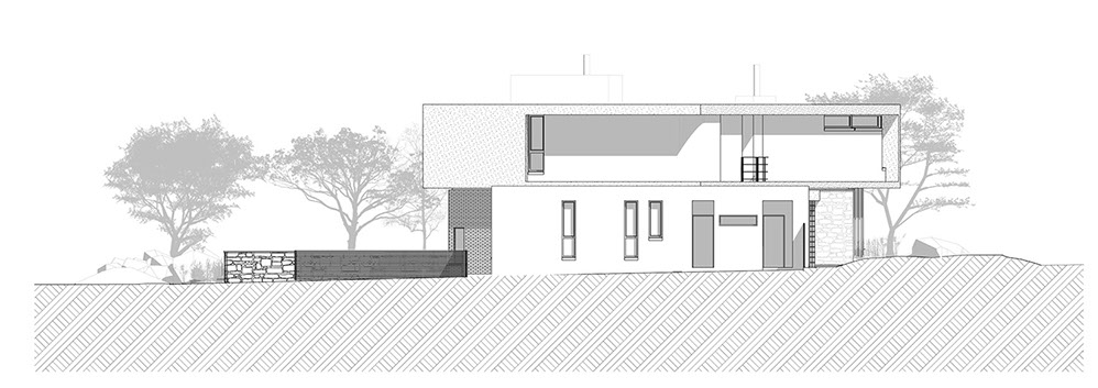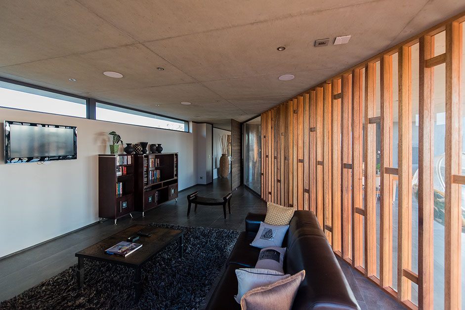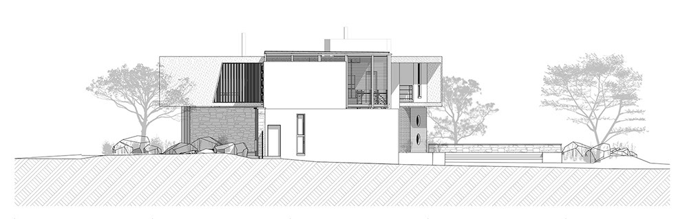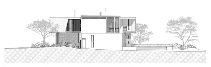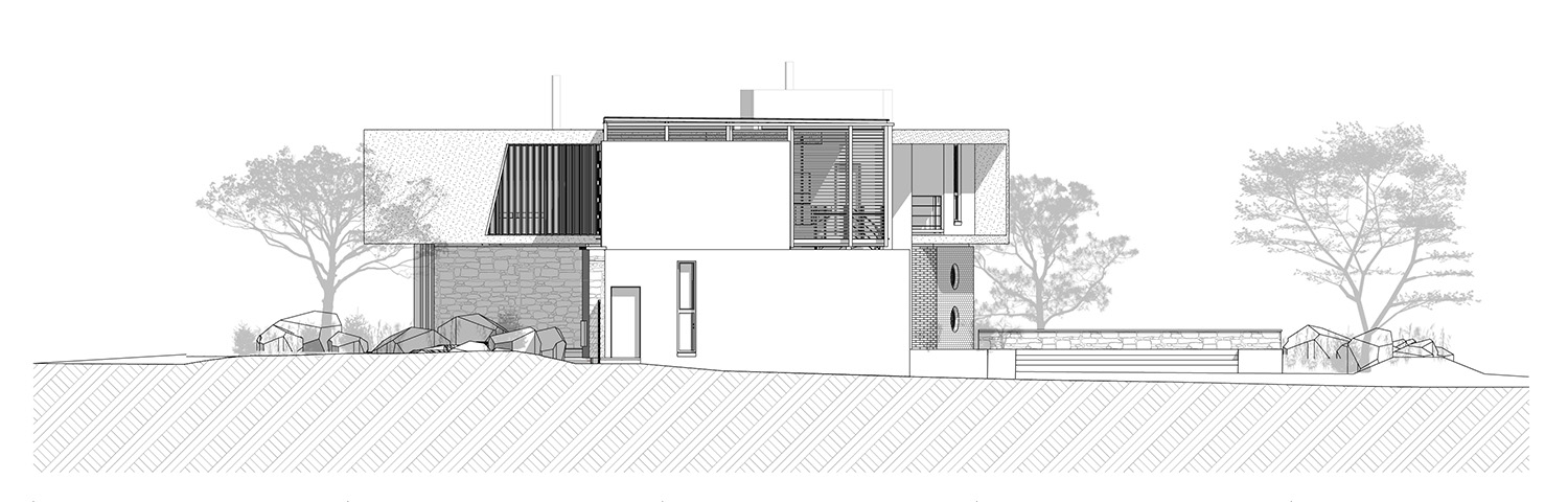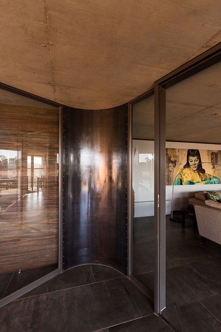 Sweeping structural curves and cutouts together with soft and hard, cold and warm materials attempts to connect the dwelling to the landscape through careful elemental composition and material co-ordination as a complete dwelling envelope that responds to the climate and its surroundings.