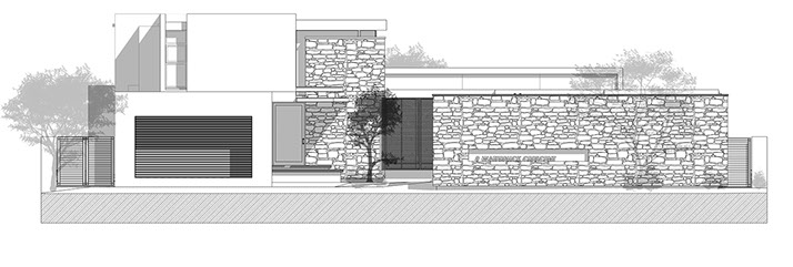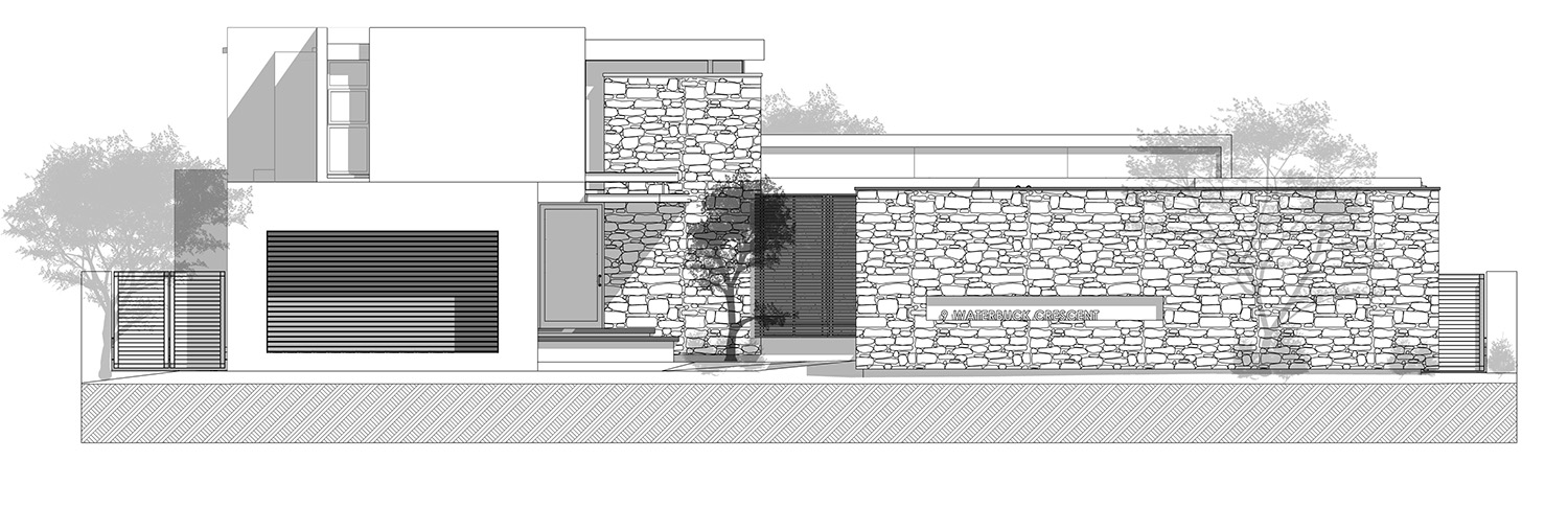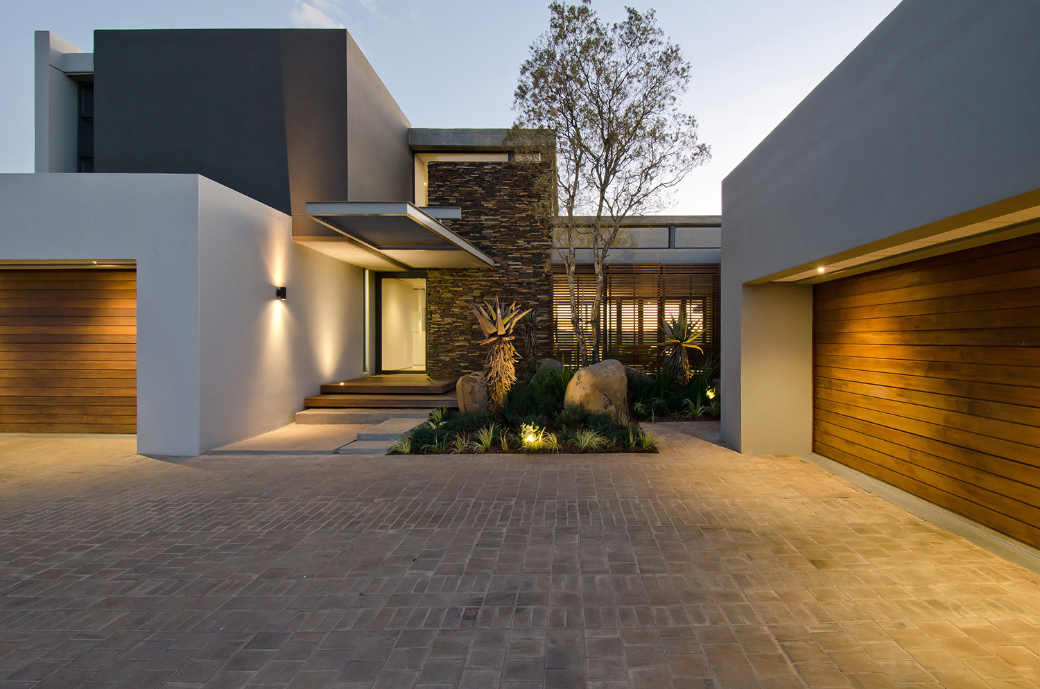 Featuring a golf course fairway view accompanied by lush wetlands to the South, House Nel called for a contemporary family home that maximizes the view to the South. With access directly from the North, orientation became a key obstacle to address. The dwelling features a traditional family home accommodation schedule with the exception of the client’s need for 5 garages. The garage requirement had to be carefully considered due to the North only vehicular access of the site. Visitors are greeted with a delicate palette of stone clad walls, timber screens and landscaping when approaching the home.