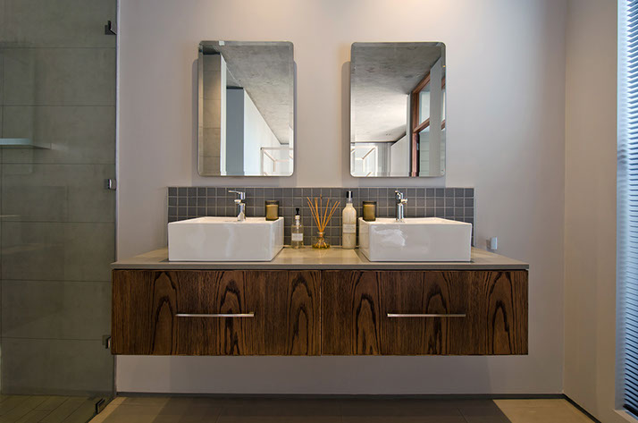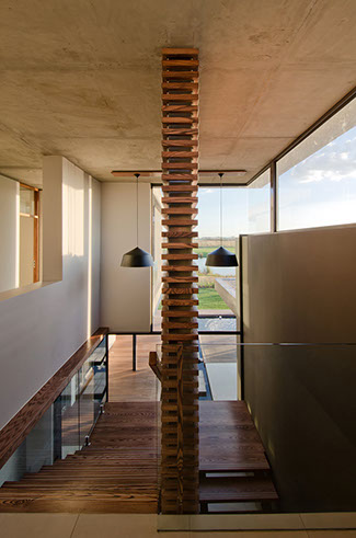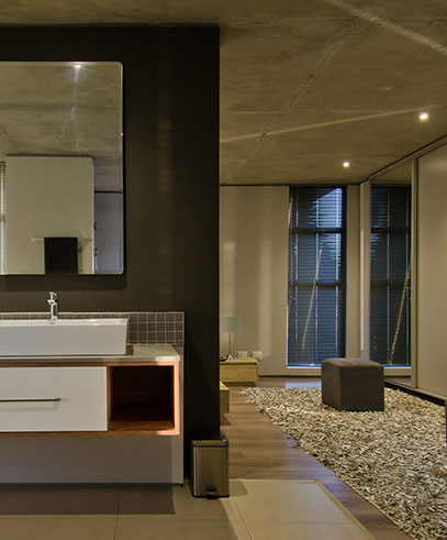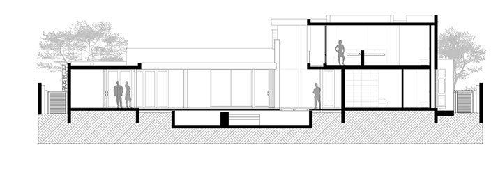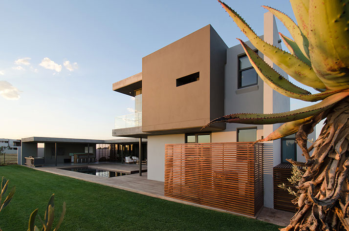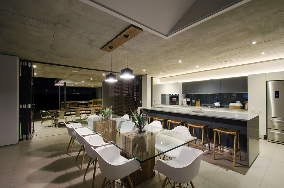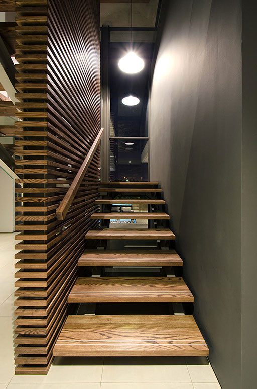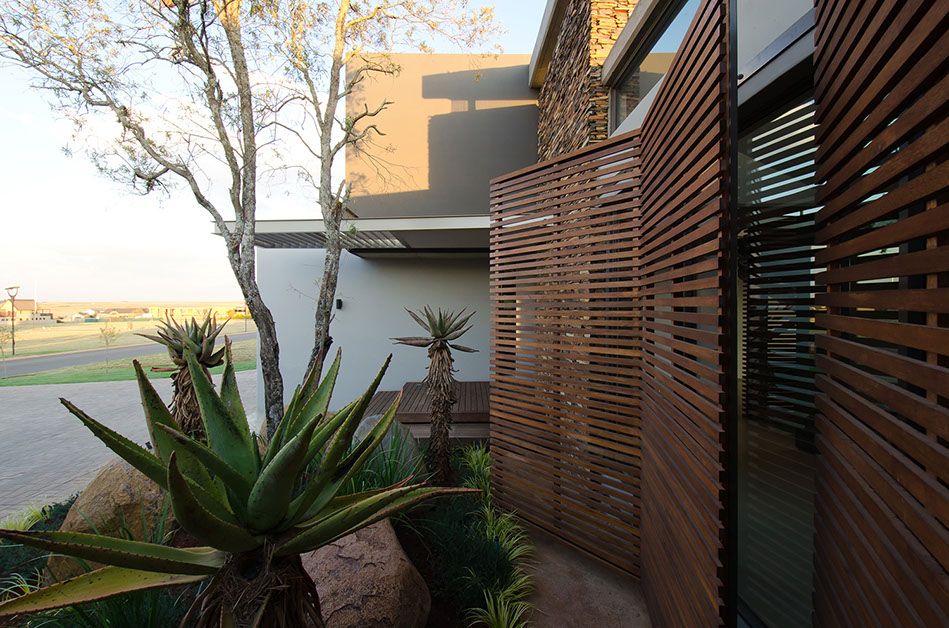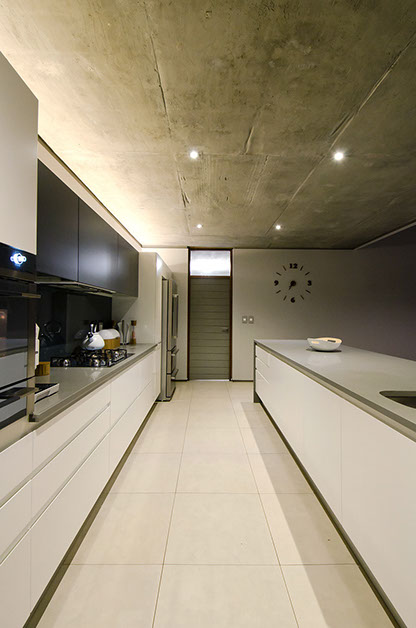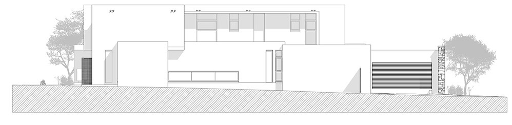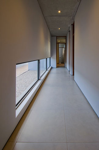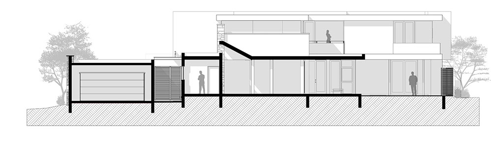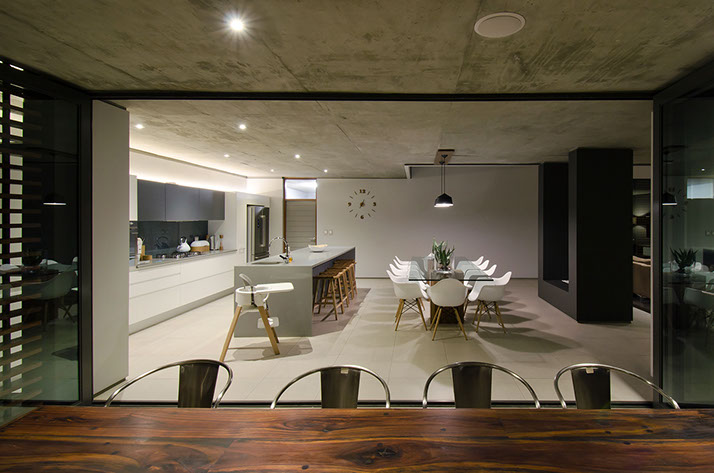 With northern exposure being minimal the living and dining room roof slab opens upwards at a subtle angel to allow northern solar exposure and subsequently becomes one of the dominant architectural features of the home. Narrow cross sections allow for good natural ventilation and together with the concrete thermal mass roof slabs lowers the temperature of the interior spaces in summer months. For solar control and privacy concerns, multiple fixed and adjustable hardwood screens were detailed on the South, West and Northern facades.