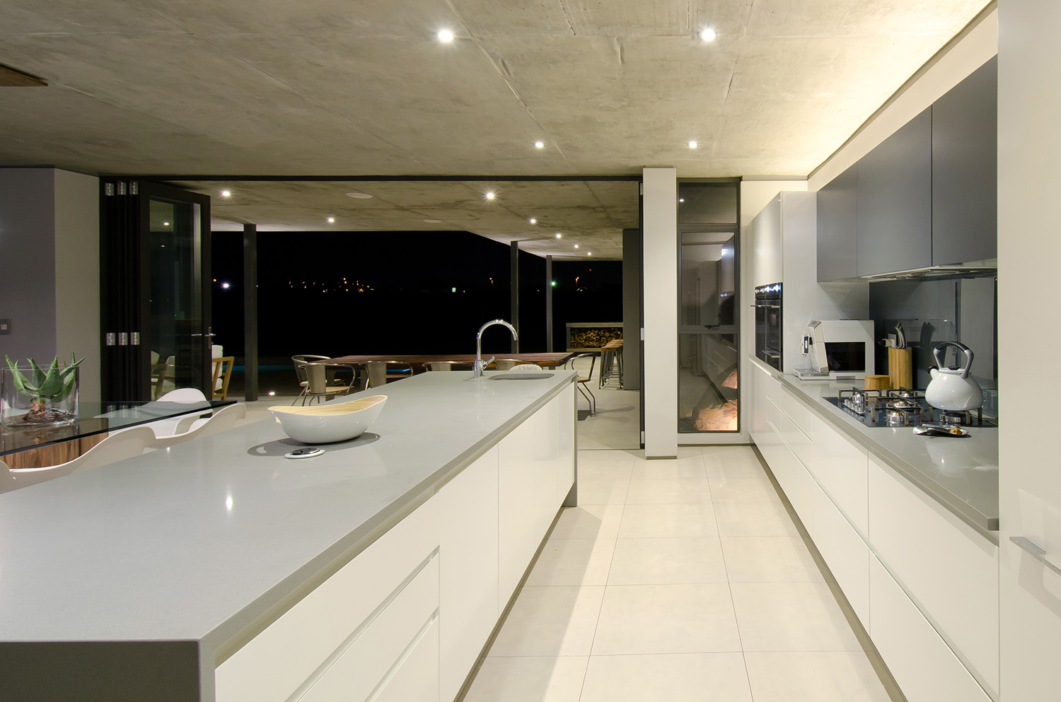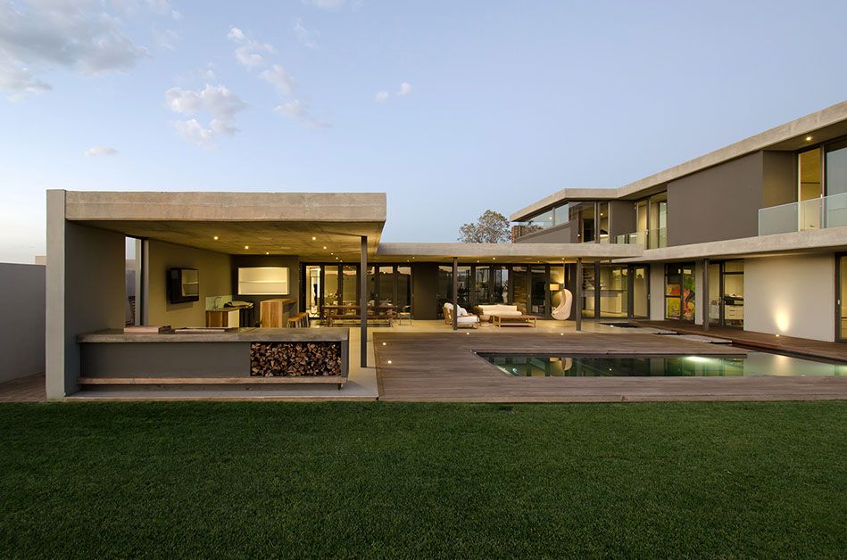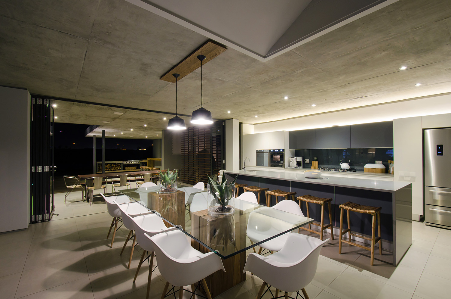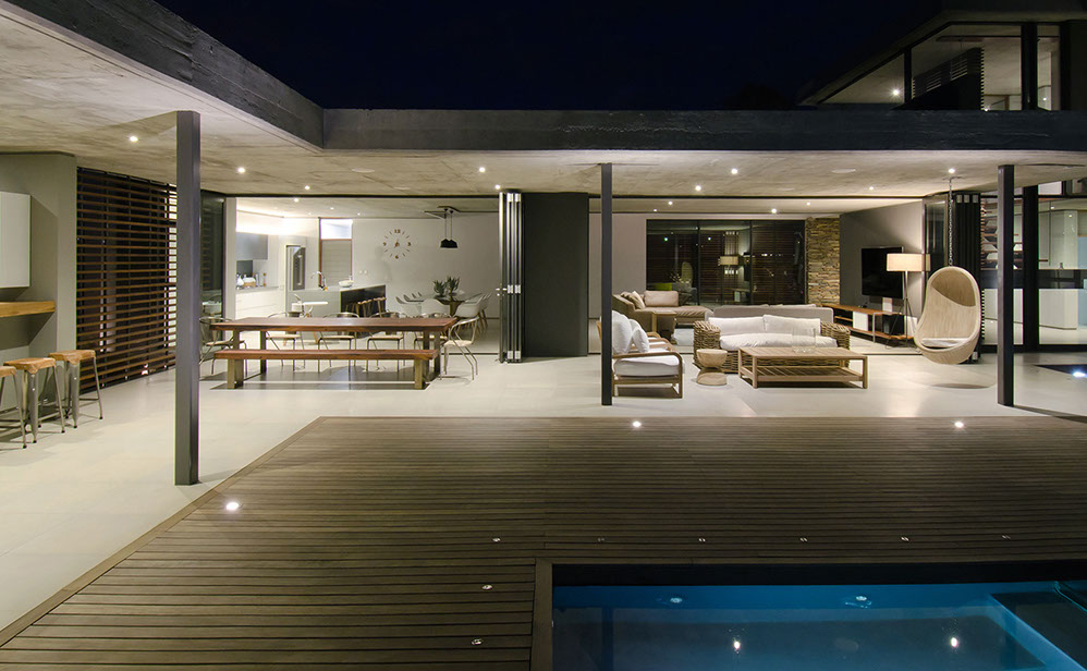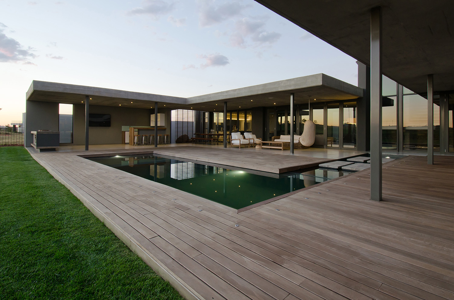 Due to the specific accommodation and site limitations a U-shape footprint was implemented for the overall layout. By orientating the living and dining room area to the north, allows the house to live out to the south overlooking the view. With the southern patio area becoming the heart of the house, bedrooms to the East are directly connected to a naturally aged hardwood deck patio, accompanied with a L-shaped pool wrapping around the deck area. Large concrete slab overhangs protect the living and sleeping areas from eastern and western sun and with the patio situated South, the overhangs allows for the use of large fenestration areas. Glass sliding folding doors in the open plan living and dining area opens up onto the patio and deck area creating one large open indoor and outdoor living space. When fully opened the golf course view over the wetland becomes the main feature and movement between indoor and outdoor spaces is unrestricted.