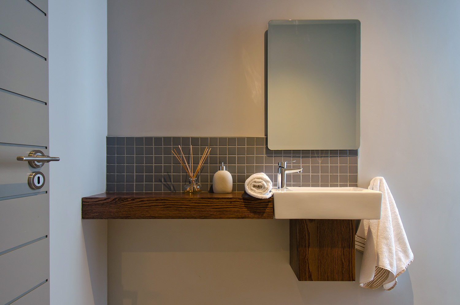 Ground floor and first floor levels are connected with a detailed white oak timber staircase resulting in a prominent feature when entering the house. The main colour palette; off shutter concrete ceilings and walls in shades of architectural greys are softened by the use of stained solid white oak cladding to the staircase treads and landing as well as the support structure.