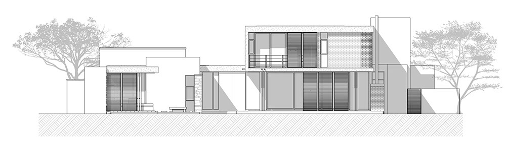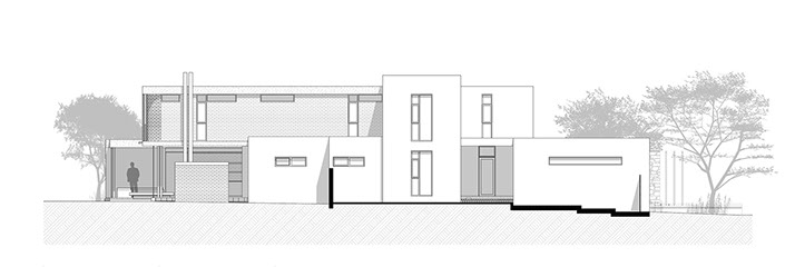Spatially, the architecture employs strong horizontal lines with strategically placed vertical elements to form a balanced composition. Connecting the interior and exterior was of cardinal importance and the design incorporates various skylights together with floor-to-ceiling glazing and sliding glass doors to facilitate a seamless flow of activities. Aesthetically we disposed of superficial ornamentation and instead engaged light and shadow together with the authentic use of raw, earthy materials to govern the spatial qualities of the home. The consistent use of timber, glass, steel, fair-face brickwork and off-shutter concrete, both inside and out, ensures that the textures and finishes form a unified whole - an understated, yet timeless back-drop to a relaxed, modern Highveld lifestyle.