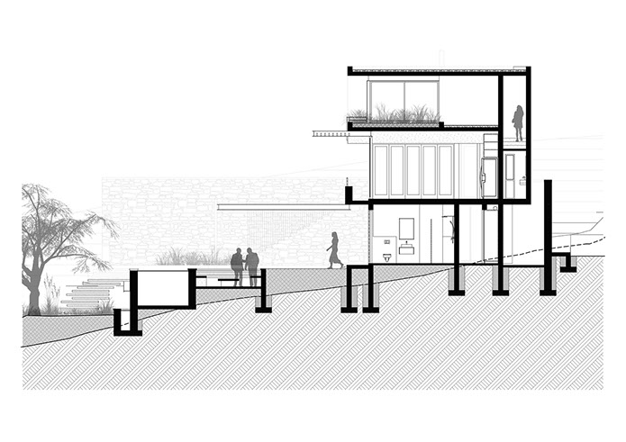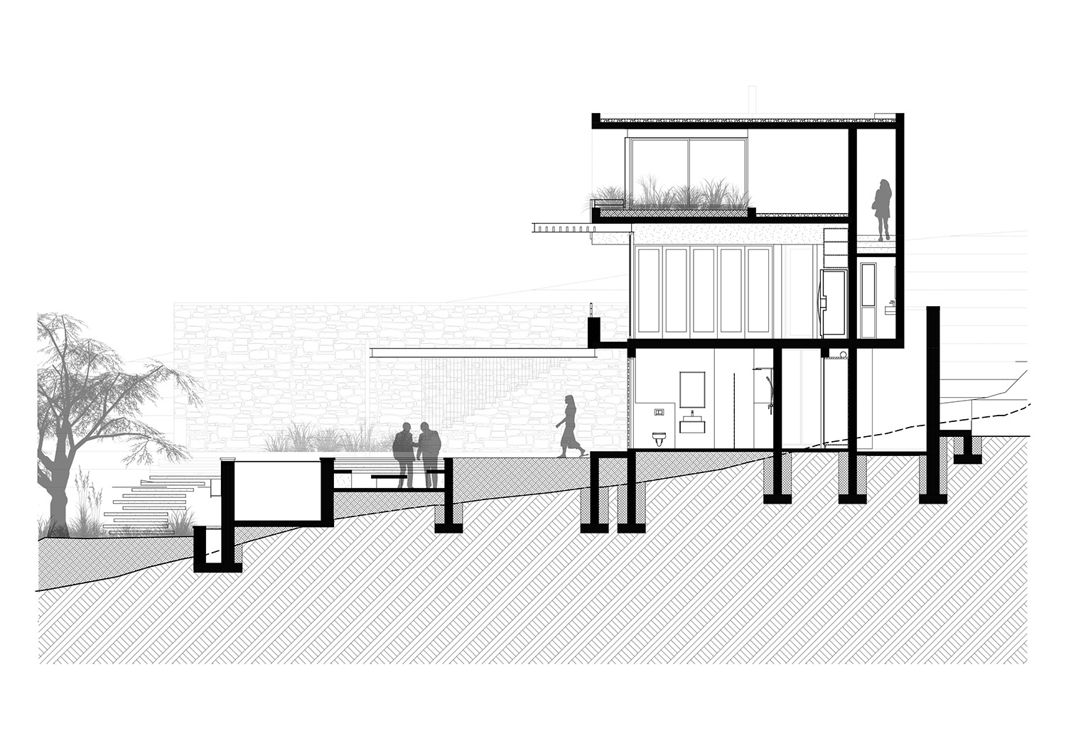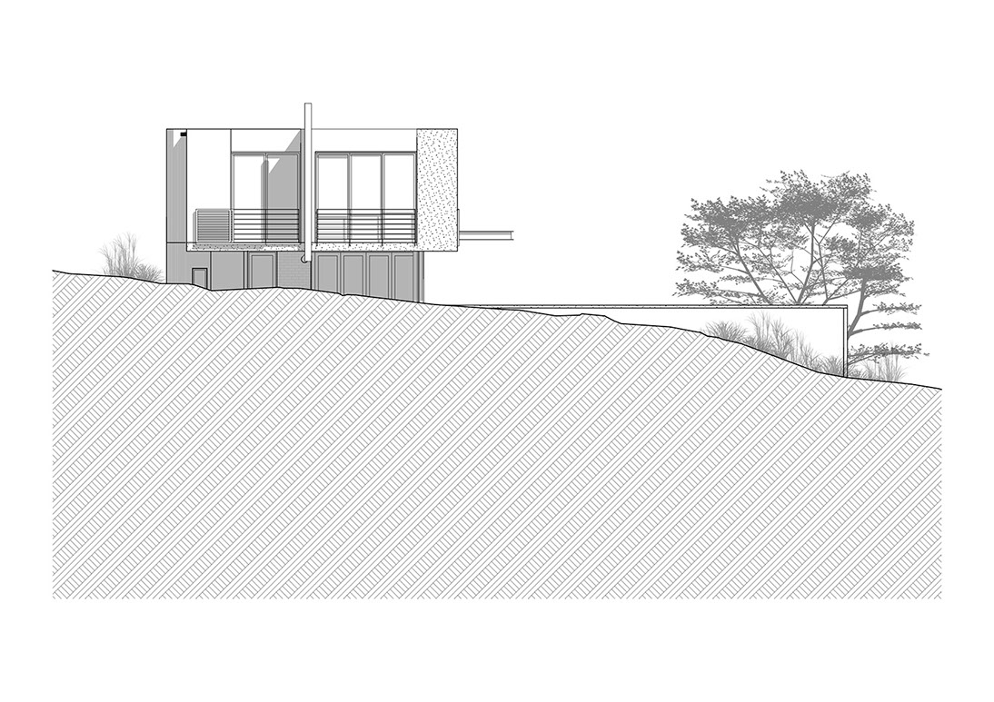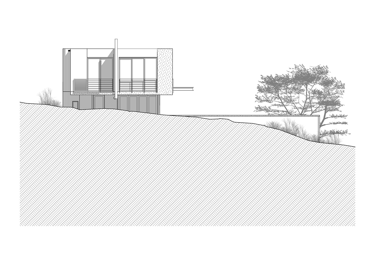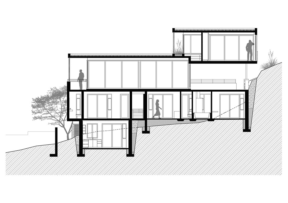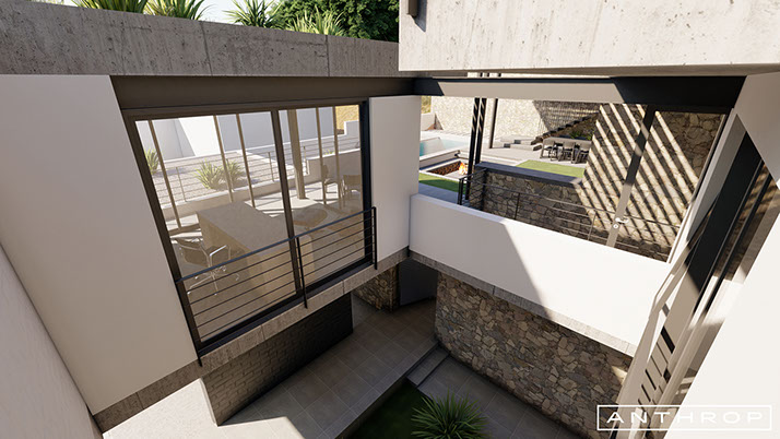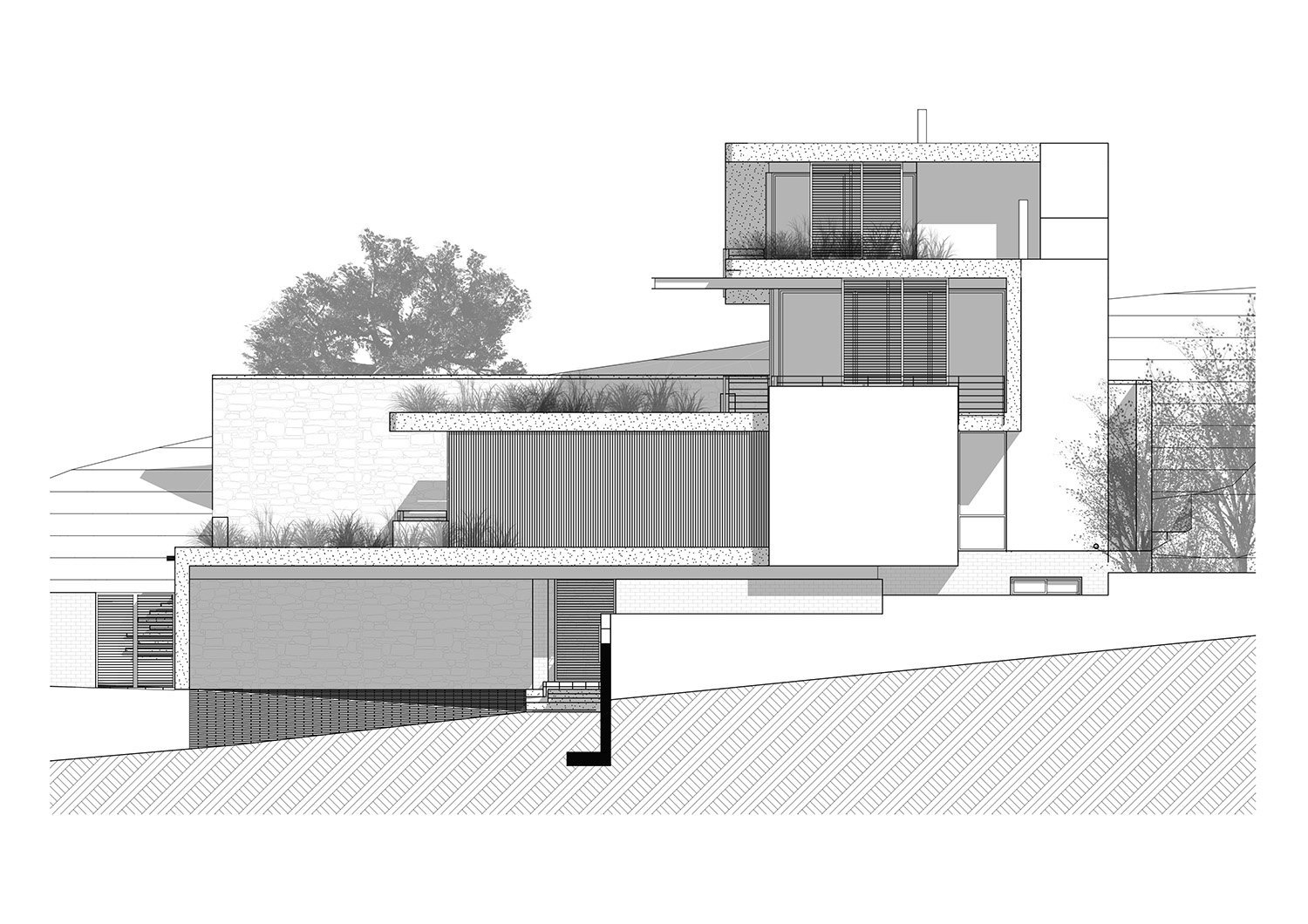 The house is subsequently divided into four levels. The lower ground storey contains the garage and entrance into the house; the ground storey contains the bedrooms, bathrooms, study and PJ Lounge; the first storey contains all the interior open plan living spaces and outdoor living spaces; and the second storey contains the main bedroom suite. Accessing the stand from the west, visitors arrive at street level, and are then guided by a walkway leading towards a natural rock cladded wall from the arrival area up towards the front door.