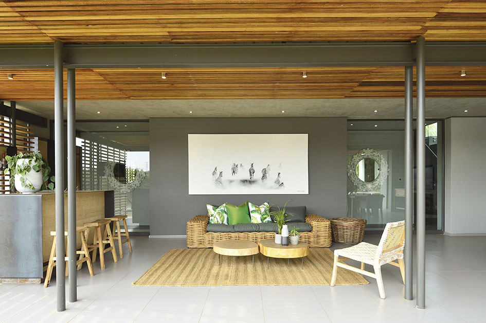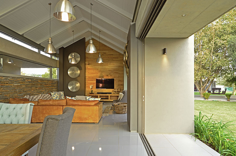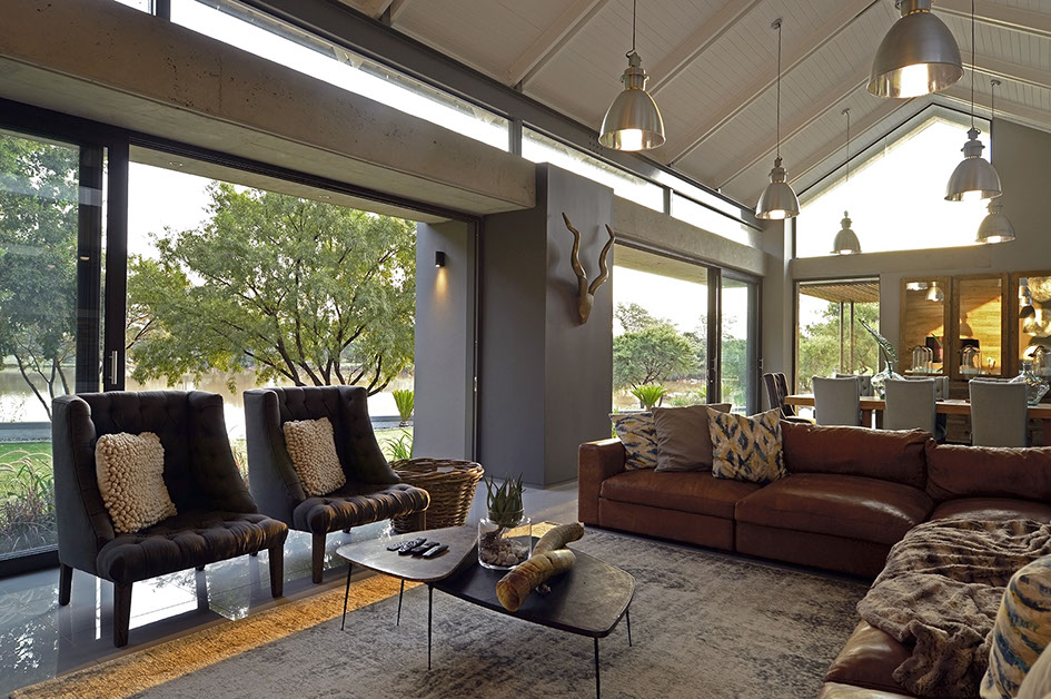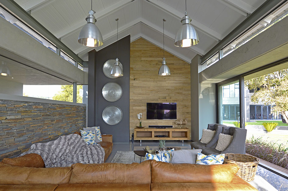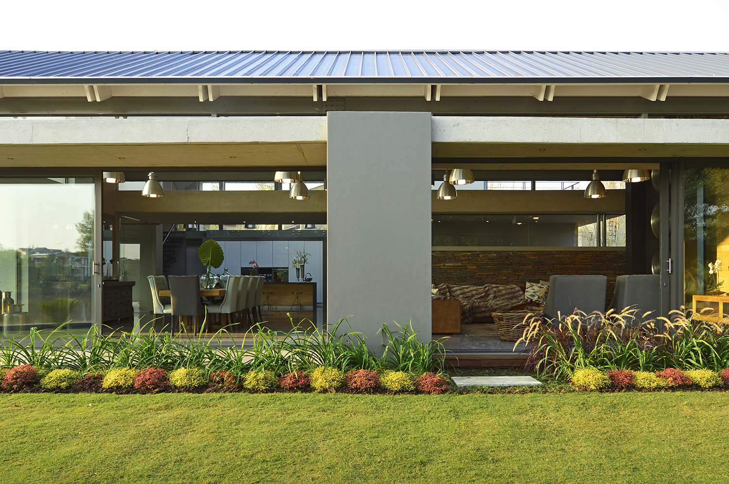 Another concern was capturing the magnificent dam view to the South but yet somehow gaining much needed northern sunlight.The stand shape also didn’t lend itself in favor of the envisaged planning forcing the required 3 garages onto the cul-de-sac north east of the stand. The floor plan therefore features an open plan living, dining & kitchen area with 2 bedrooms off a central axis or rather “hallway” running east and west and a shared bathroom at the most western end of the house. Large windows in the hallway frames vistas over the magnificent dam views and established estate landscaping.