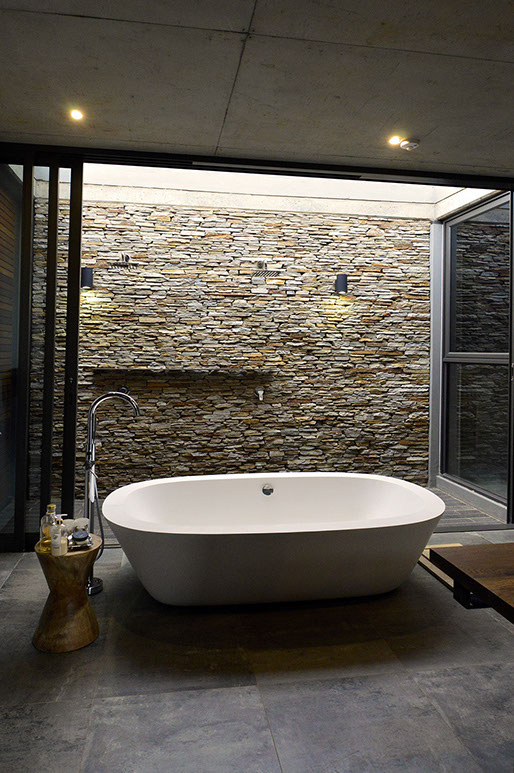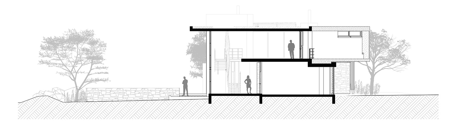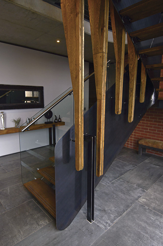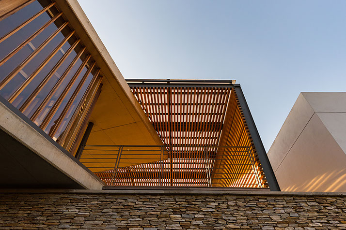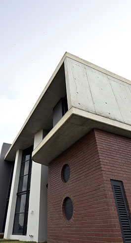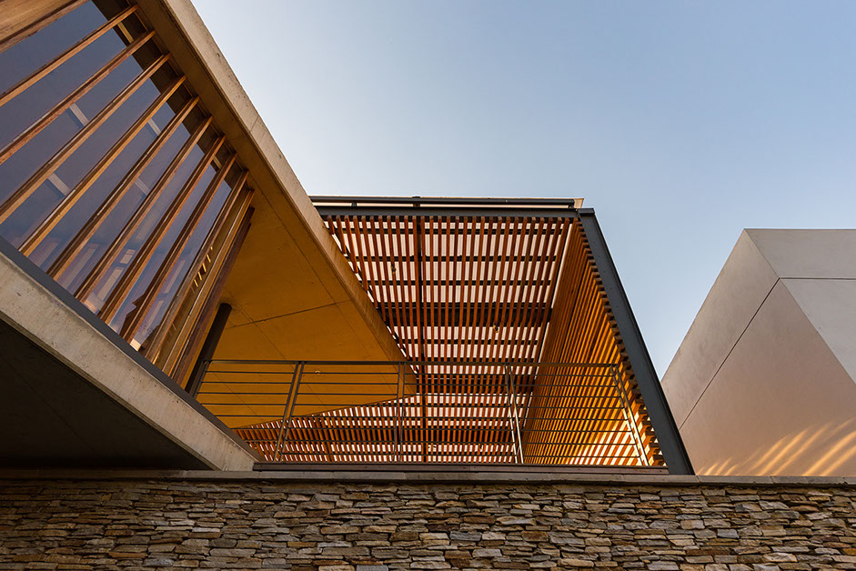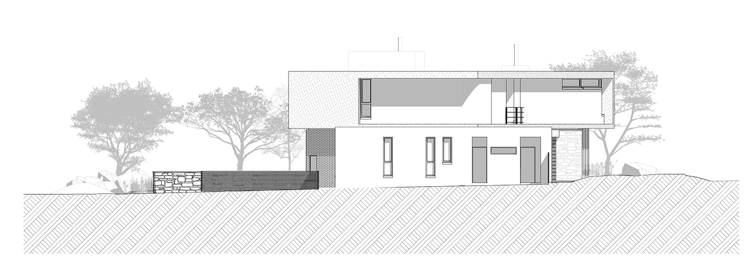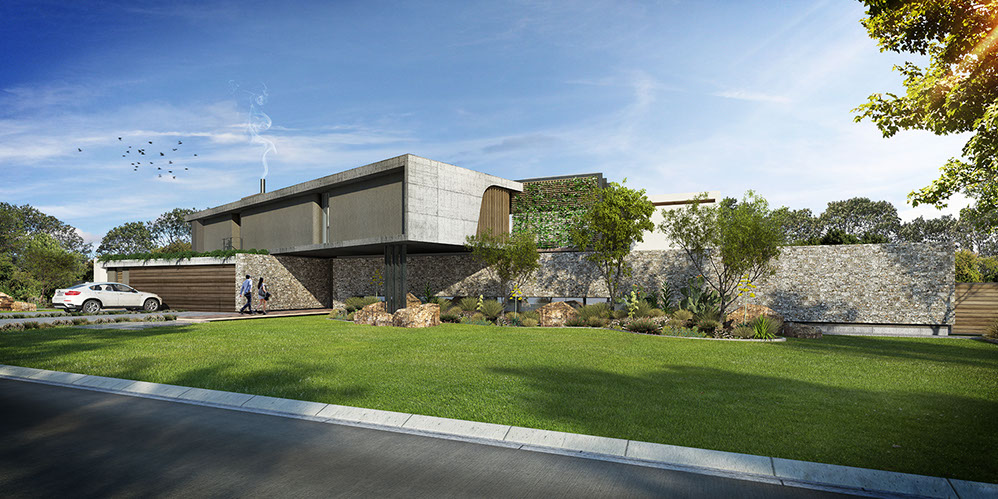 Sweeping structural curves and cutouts together with soft and hard, cold and warm materials attempts to connect the dwelling to the landscape through careful elemental composition and material co-ordination as a complete dwelling envelope that responds to the climate and its surroundings.