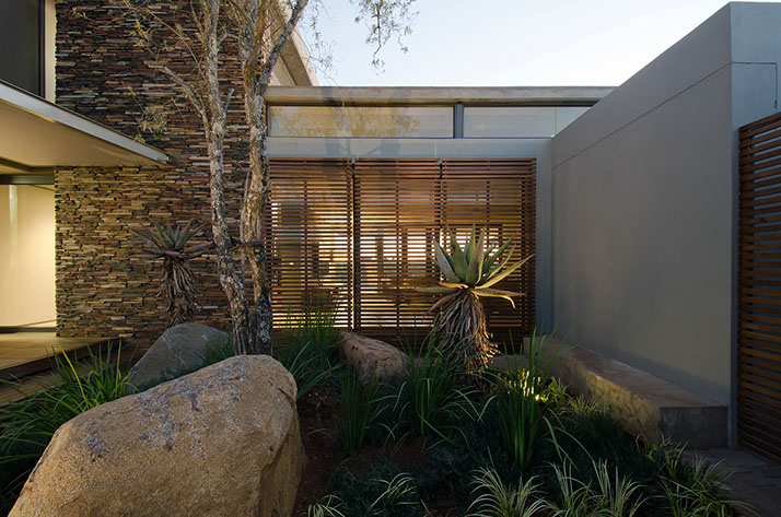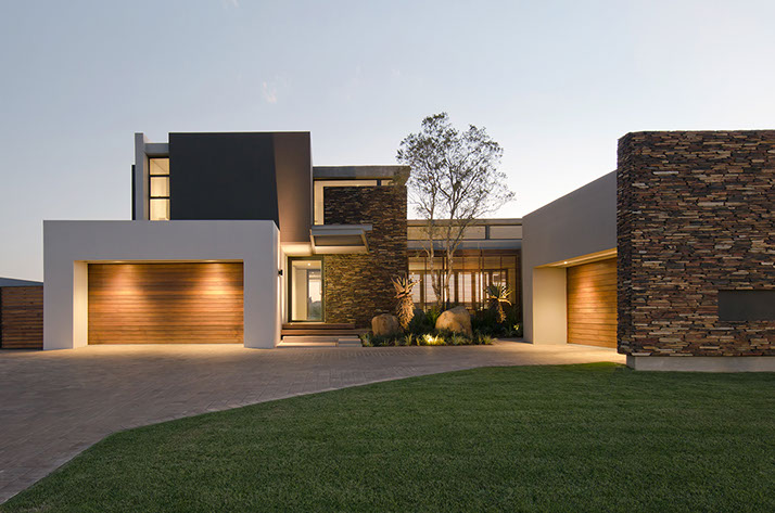 Featuring a golf course fairway view accompanied by lush wetlands to the South, House Nel called for a contemporary family home that maximizes the view to the South. With access directly from the North, orientation became a key obstacle to address. The dwelling features a traditional family home accommodation schedule with the exception of the client’s need for 5 garages. The garage requirement had to be carefully considered due to the North only vehicular access of the site. Visitors are greeted with a delicate palette of stone clad walls, timber screens and landscaping when approaching the home.