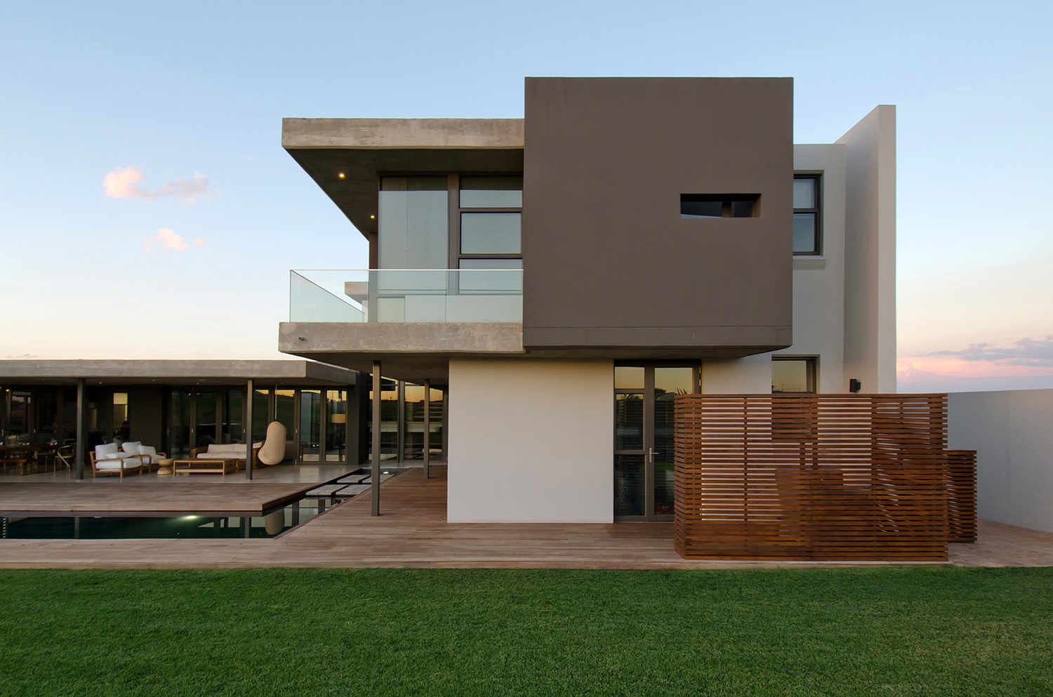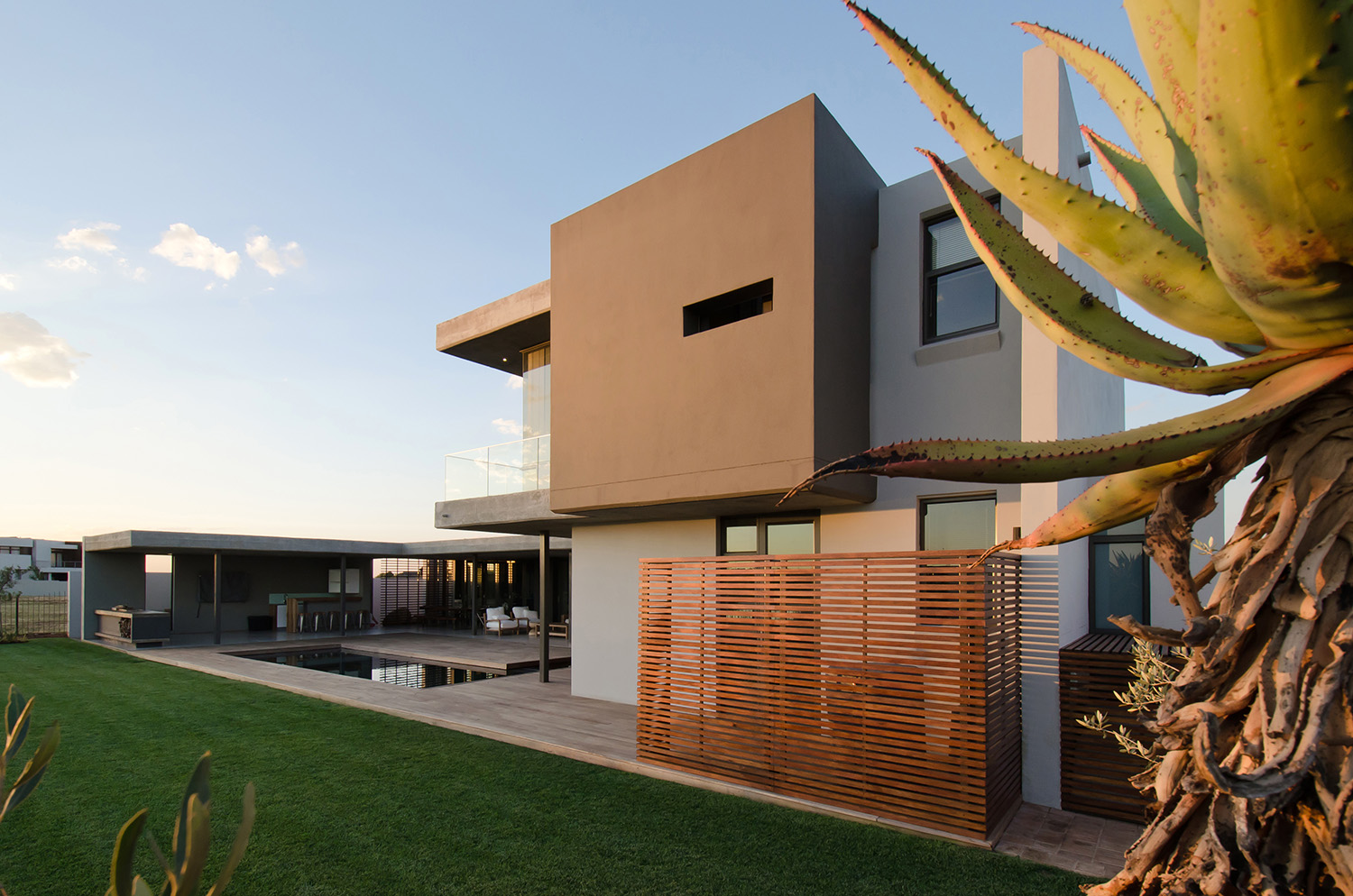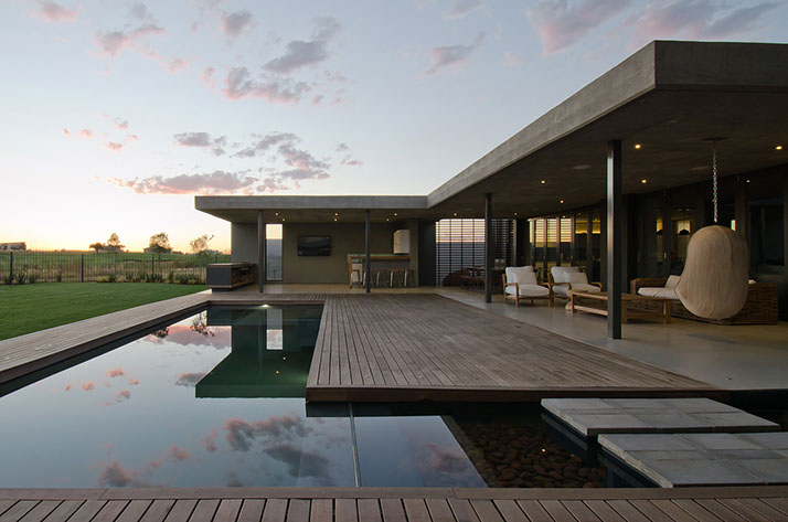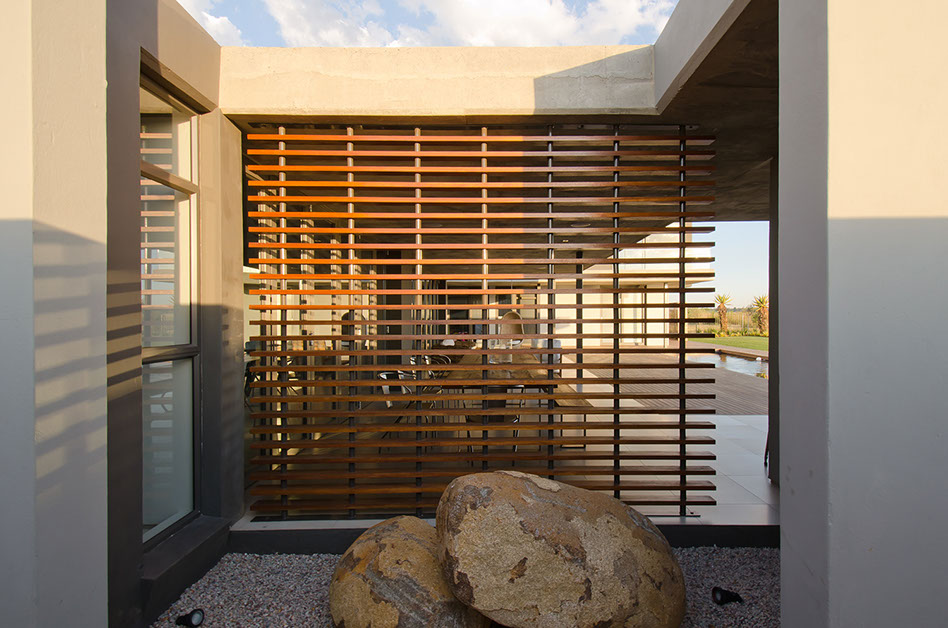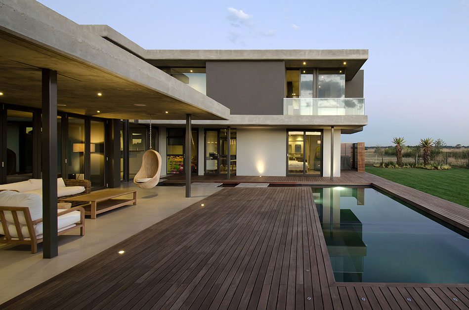 Due to the specific accommodation and site limitations a U-shape footprint was implemented for the overall layout. By orientating the living and dining room area to the north, allows the house to live out to the south overlooking the view. With the southern patio area becoming the heart of the house, bedrooms to the East are directly connected to a naturally aged hardwood deck patio, accompanied with a L-shaped pool wrapping around the deck area. Large concrete slab overhangs protect the living and sleeping areas from eastern and western sun and with the patio situated South, the overhangs allows for the use of large fenestration areas. Glass sliding folding doors in the open plan living and dining area opens up onto the patio and deck area creating one large open indoor and outdoor living space. When fully opened the golf course view over the wetland becomes the main feature and movement between indoor and outdoor spaces is unrestricted.