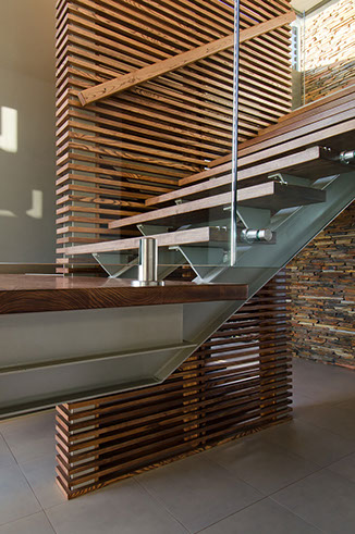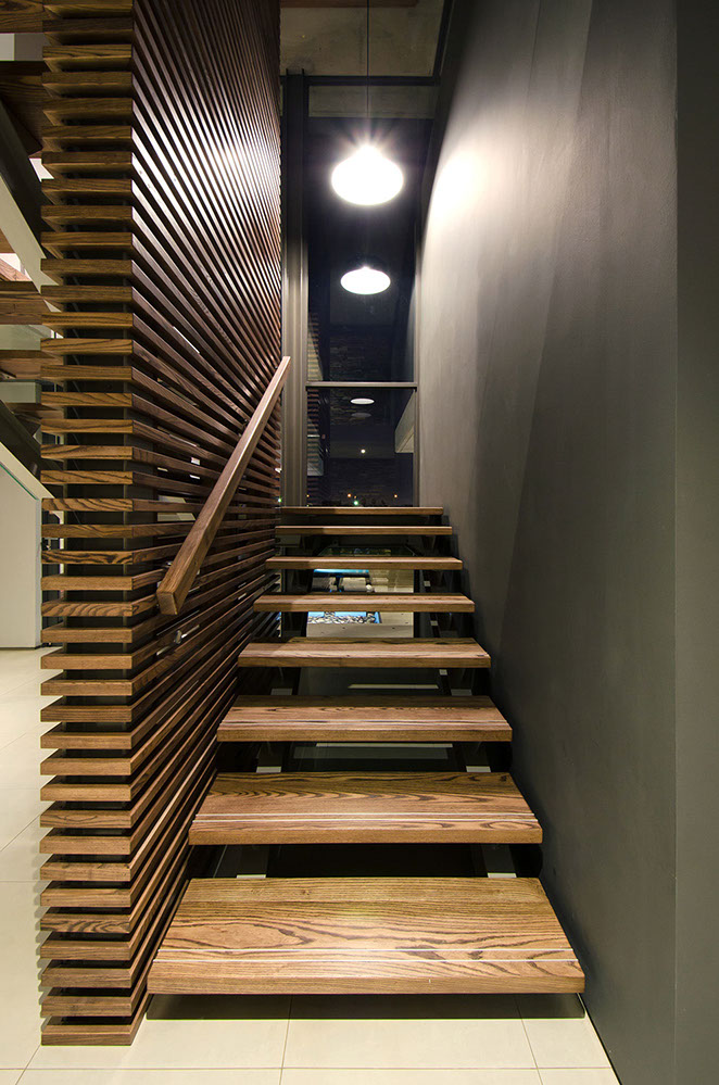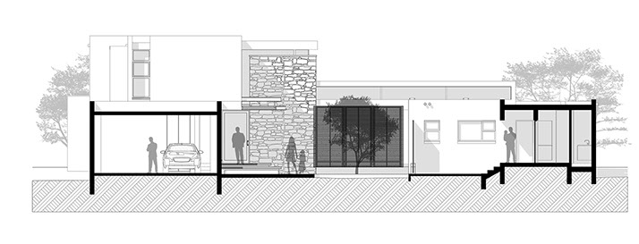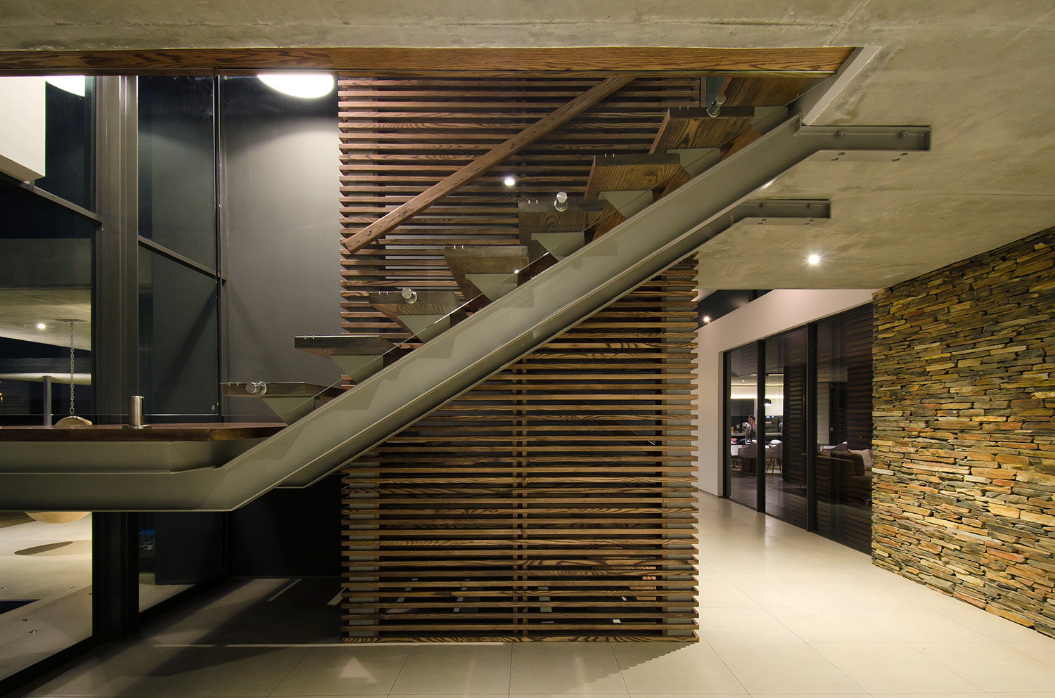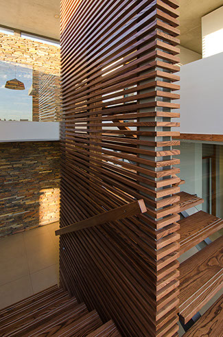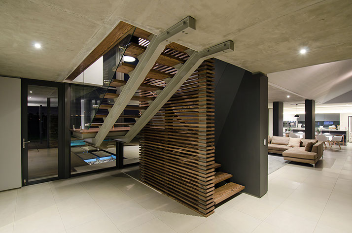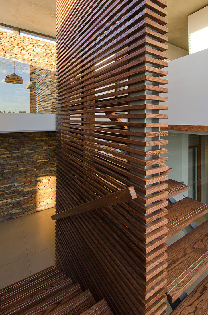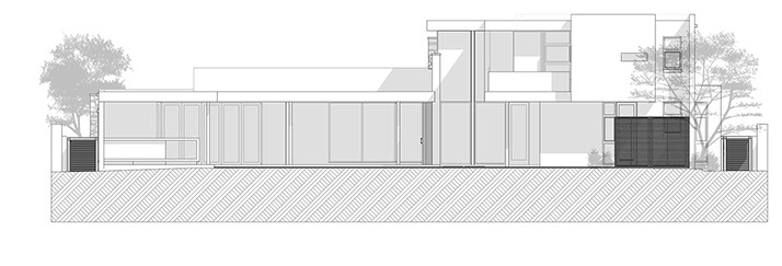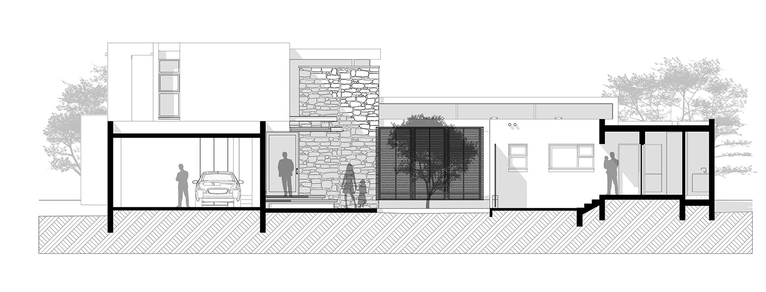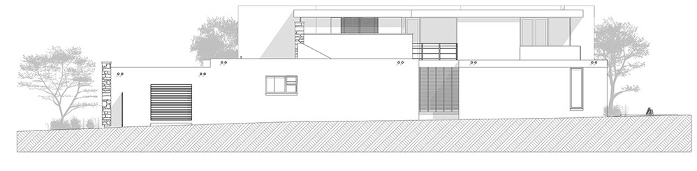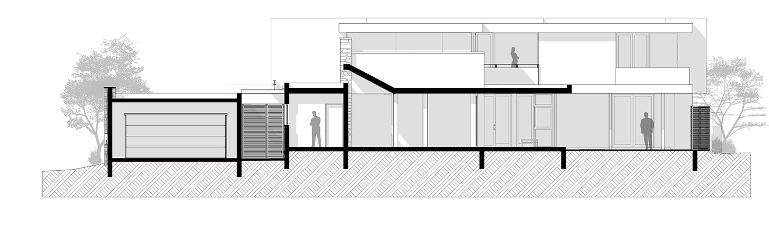 With northern exposure being minimal the living and dining room roof slab opens upwards at a subtle angel to allow northern solar exposure and subsequently becomes one of the dominant architectural features of the home. Narrow cross sections allow for good natural ventilation and together with the concrete thermal mass roof slabs lowers the temperature of the interior spaces in summer months. For solar control and privacy concerns, multiple fixed and adjustable hardwood screens were detailed on the South, West and Northern facades.